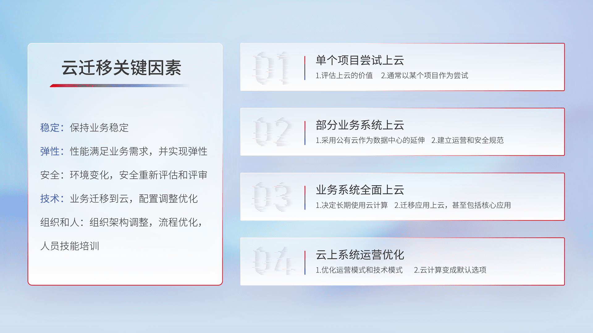 结合实际业务,,,从规划设计、、云平台选型、、云原生改造、、、数据迁移、、、集成交付,,,,迁移全过程为客户识别最佳上云路径,,,做好风险识别管理,,,,设计网络架构、、、、身份权限、、安全审计合规、、操作审计、、日志审计、、、监控告警策略、、、、多站点容灾设计等,,,对云上基础设施进行整体规划,,,提升IT治理水平,,以满足弹性、、高可用、、、高性能的需求。。