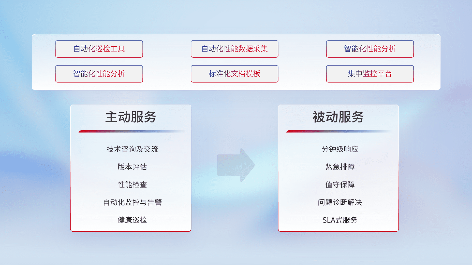 智能化工具和标准化文档,,,保障服务质量,,,提供主动服务(包含技术咨询、、、版本评估、、性能检查、、、自动化监控与告警、、、健康巡检)和被动服务包含(分钟级响应、、、紧急排障、、、值守保障、、问题诊断解决、、、SLA服务)。。